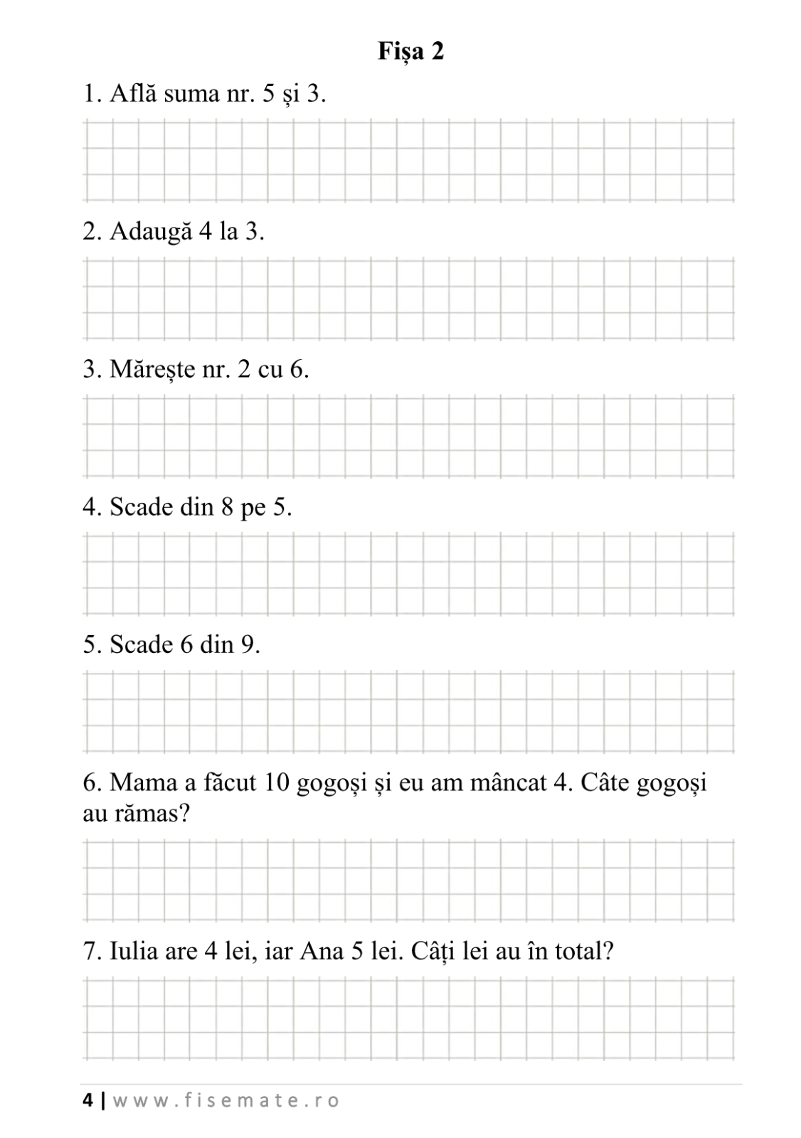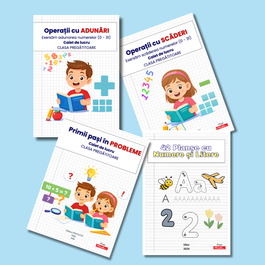 Setul contine 4 caiete de lucru: operatii cu adunari, operatii cu scaderi, primii pasi in probleme si numere si litere.
